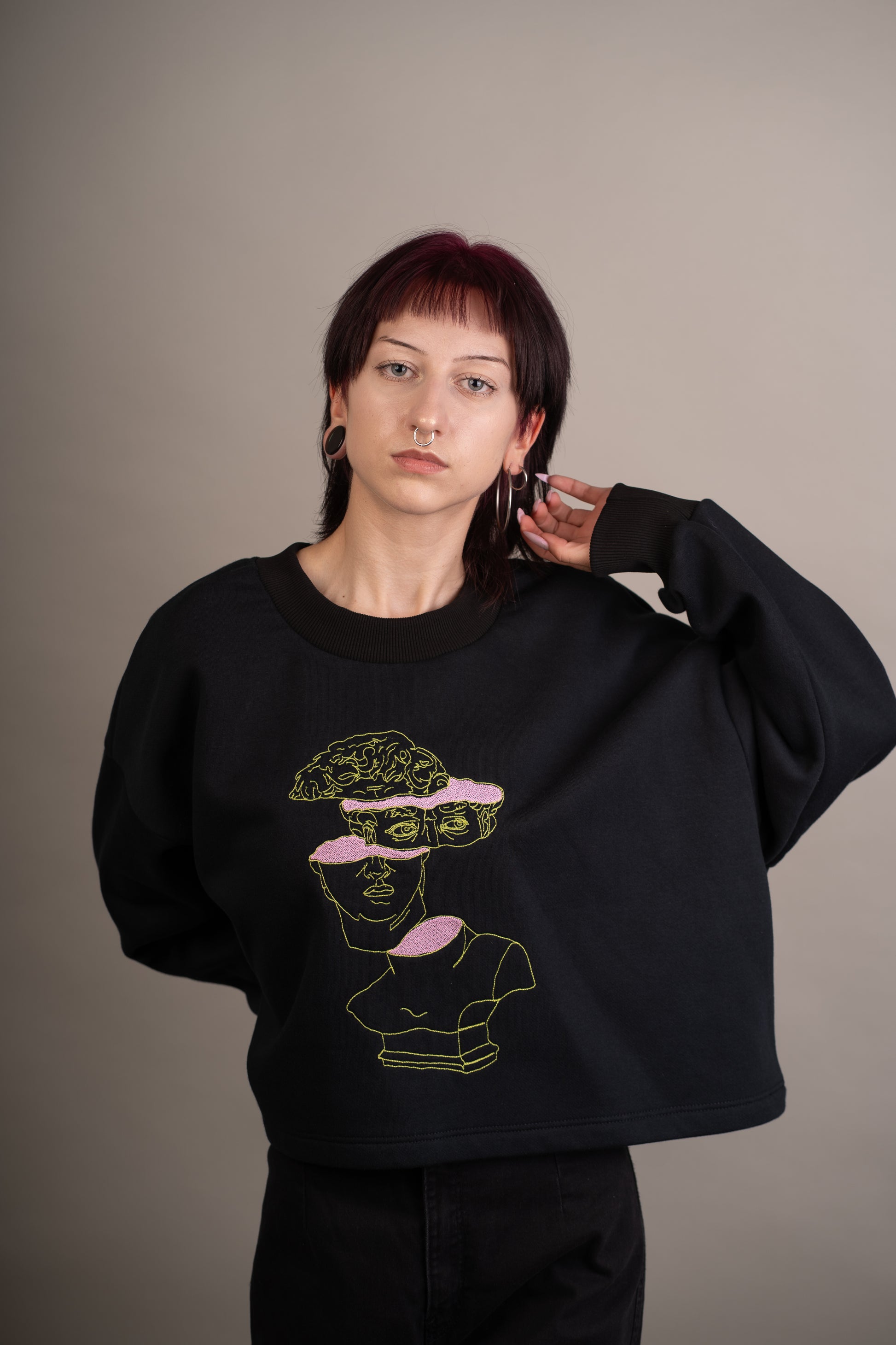 Long-sleeved sweatshirt with ribbing at neck, cuffs and hemmed at waist.